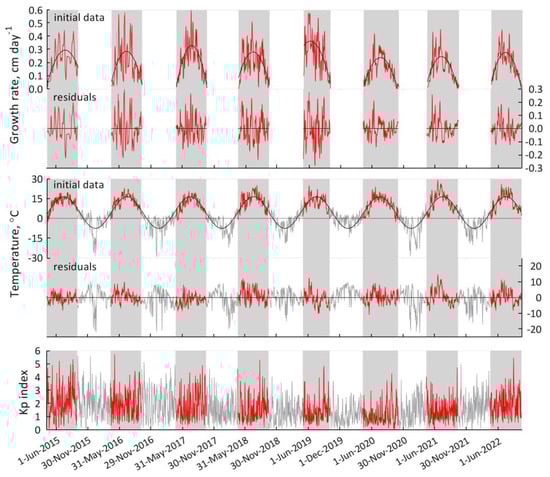 For a better understanding of the issue, the change in the growth response to local temperature fluctuations along the Kp gradient was estimated. This analysis implied elimination of seasonal trends from both analyzed patterns. The second-order polynomial trend induced by the seasonal temperature course was removed from the growth rate pattern []. The harmonic trend created by the annual cycle was removed from the temperature pattern. This trend was built using the sum of sinusoids model. A sinusoid with a period of 365.3 days was taken as its model, which best approximates the temperature data by R2. After detrending, according to the principle described above, a sliding window correlation was carried out between the residuals of the growth rate and temperature.