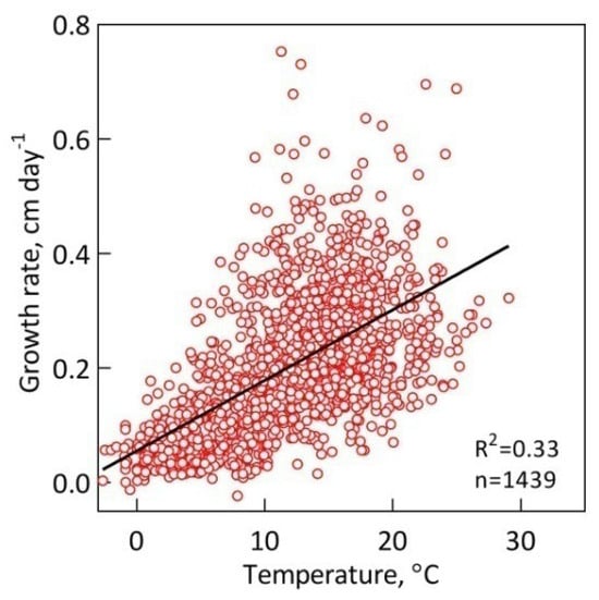 The relationship between growth and productivity of sphagnum mosses and temperature has been discussed in numerous papers [,,,,,,,,,], but not all of them obtained such high estimates of the temperature effect. One of the reasons is the coarser resolution of these studies, which does not allow registration of the growth limitation by low temperatures at the beginning and end of the growing season. Another reason is that under natural conditions, a temperature rise stimulates physiological processes in sphagnum mosses, while negatively impacting external moisture []. Therefore, its effect on growth and productivity is ultimately determined by the balance between these two components in a particular place of study. In our case, S. riparium grew in waterlogged habitats. Therefore, the temperature mainly affected physiological processes but rarely limited the external moisture of the sphagnum mat. The limitation was observed only in July–August in some years, when the mire water level strongly decreased under a combination of high temperature and a long absence of precipitation []; however, this process did not systematically affect the results of our study.