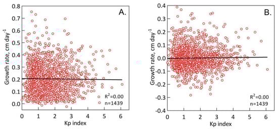 Growth response of S. riparium to the geomagnetic Kp index. The dependence of the growth rate (A) and its residuals (B) on the Kp index is presented.