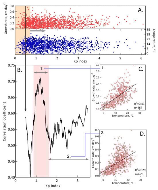 Change in the growth response of S. riparium to temperature along the Kp gradient. (A) Values of growth rate and temperature, sorted by the gradient of the Kp index. (B) Pattern of sliding window correlation coefficients. To calculate these correlation coefficients, here, we used a sliding window of 200 values (section (A) highlights an example window for the first coefficient). In this window, we calculated the average Kp (in section A, this is shown by a bold vertical line turning into an arrow) and the corresponding correlation coefficient. The Kp interval from 0.87 to 1.61 is highlighted in color. (C,D) Examples of the growth response to temperature at different ranges of the Kp indices (these ranges are shown by arrows in section (B)).