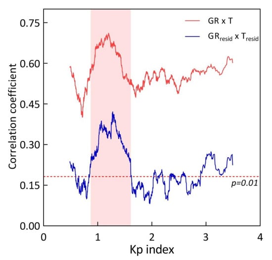 Thus, the identified Kp range from 0.87 to 1.61 was maintained while examining the influence of minor fluctuations of temperature on growth rate fluctuations. This indicates that the revealed Kp interval is unlikely to be an artifact and likely reflects objective geomagnetic conditions that enhance the growth rate’s response to temperature changes.