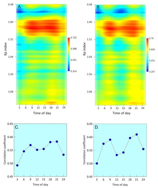In conclusion, we examined the change in the growth response of S. riparium to diurnal temperature along the Kp gradient. This analysis confirmed the presence of the favorable Kp interval described above, where Sphagnum exhibits the highest growth response to temperature. However, the most intriguing finding of this analysis was the differences in temperature response at different times of the day. The temperature growth response has two characteristic peaks, which are separated from each other by a decline (Figure 7). The first peak occurs between 6 and 9 h, and the second peak occurs between 18 and 21 h. A decline occurs between 12 and 15 h. Because these peaks may not be clearly noticeable with air temperature data (Figure 7A,C), we also involved soil surface temperature data (Figure 7B,D), which was recorded at the weather station. When utilizing this data, the peaks of the growth response intensify, and the decline between them deepens. Thus, our findings indicate that Sphagnum growth response to diurnal temperature follows a bimodal pattern. This bimodal pattern is noticed in both favorable and unfavorable geomagnetic conditions.