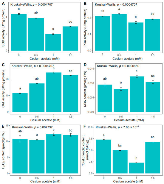 The total phenolic content (TPC) decreased by 32.1% and 68.5% in plants grown in media supplemented with 0.5 and 1 mM cesium acetate, respectively. However, when 1.5 mM cesium acetate was applied, the TPC content increased to values similar to those obtained in control samples (7.3 mmol GAE g−1) (Figure 1F).