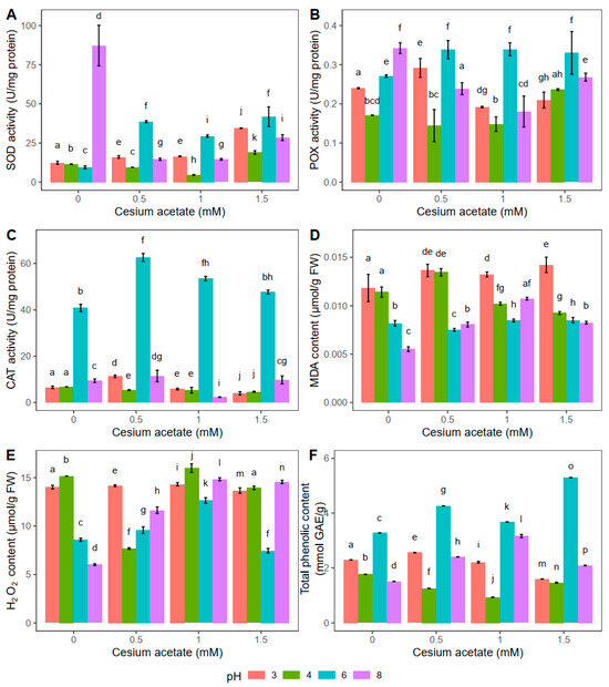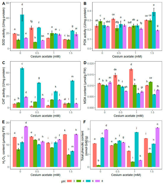 Oxidative stress-related parameters in Atrichum undulatum exposed for 24 h to different concentrations of cesium acetate at different pH (3, 4, 6, 8) (experiment II—heavy rain simulation): superoxide dismutase (SOD) activity (A), peroxidase (POX) activity (B), catalase (CAT) activity (C), malondialdehyde (MDA) content (D), hydrogen peroxide (H2O2) content (E), and total phenolic content (F). Data are represented as the mean ± standard deviation. Different letters above the bars represent statistically significant differences (p < 0.05) between the experimental groups.