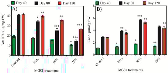Effects of the different concentrations of MGS-1 exposure on (A) total chlorophyll and (B) proline of I. batatas leaves. Results are expressed as means of replicate ± SE, where ‘*’ indicates statistical significance (p < 0.05), ‘**’ indicates statistical significance (p < 0.01), and ‘***’ indicates statistical significance (p < 0.001) according to Tukey’s test.