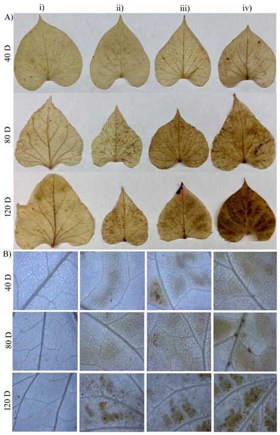 (A) Effects of various concentrations of MGS-1 exposure on H2O2 accumulation in I. batatas leaves, and (B) microscopic images of H2O2 accumulation. (i) control, (ii) 25%, (iii) 50%, and (iv) 75% of MGS-1 exposure.