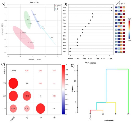 Amino acid profiling of storage root tissues grown under control and different levels of MGS-1 exposure. (A) PLS-DA score plot, (B) VIP plot, (C) correlation plot analysis, and (D) hierarchical cluster analysis.