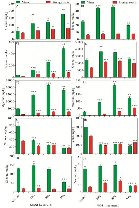 Effects of the different concentrations of MGS-1 exposure on the elemental accumulation in the vines and storage roots of I. batatas plants (A) Al, (B) B, (C) Fe, (D) K, (E) Mg, (F) Mn, (G) Na, (H) P, (I) Si, and (J) Zn. Results are expressed as means of replicate ± SE, where ‘*’ indicates statistical significance (p < 0.05), ‘**’ indicates statistical significance (p < 0.01), and ‘***’ indicates statistical significance (p < 0.001) according to Tukey’s test.
