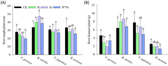 Effect of Sorghum bicolor and Solidago canadensis root exudates on below-ground growth responses: (A) root length and (B) root biomass of invasive (B. sterilis and V. persica) and native (Y. japonica, and R. acetosa) species. CK, Sl, Sr, and Sl*Sr in the graphs represent the treatments: Control (no donor plants), Solidago canadensis alone, Sorghum bicolor alone, and Solidago canadensis + Sorghum bicolor intercropped, respectively. Bars show means ± SD (n = 5). Different letters above bars indicate significant differences between treatments for each species and trait at p ≤ 0.05 by LSD test.