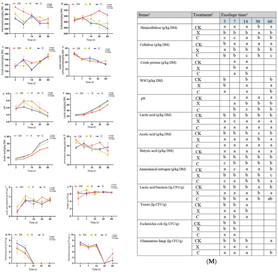 Dynamic changes in oat silage quality and microbial count with different treatment groups (A–L), (A): hemicellulose, (B): cellulose, (C): crude protein, (D): water-soluble carbohydrates, (E): pH, (F): lactic acid, (G): acetic acid, (H): ammoniacal nitrogen, (I): lactic acid bacteria, (J): yeasts, (K): Escherichia coli, (L): filamentous fungi. (M) was a table to illustrate the significance of the results, 1; WSC: water-soluble carbohydrate, 2; CK, no additive; X, inoculated with xylanase; C, inoculated with cellulase, 3; 3, 7, 14, 30, and 60 expressed different ensilage days, different lowercase letters indicate significant differences with different treatments.