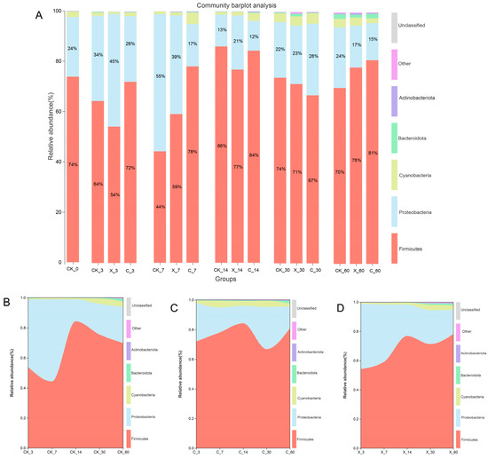 Bacterial community composition (A) and succession (B–D) at the phylum level in silage during the ensiling process. CK, no additive; X, inoculated with xylanase; (C), inoculated with cellulase; 3, 7, 14, 30, and 60 expressed different ensilage days; 0 expressed oat before ensiling; for example, CK-3 expressed that there was no additive after 3 days of silage.