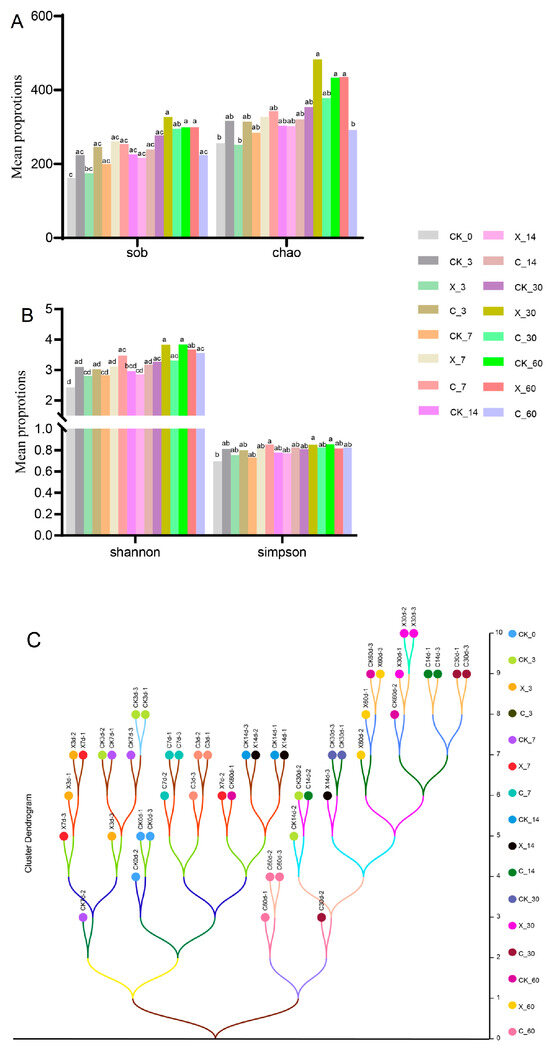 Differences in bacterial (A,B) community diversity and richness in oat silage with different additive treatments and ensilage days. (A) Sob and Chao index. (B) Shannon and Simpson index. The cluster dendrogram analysis of bacterial communities (C) on operational taxonomic units (OTUs) level in oat silage with different additive treatments and ensilage days. CK, no additive; X, inoculated with xylanase; C, inoculated with cellulase; 3, 7, 14, 30, and 60 expressed different ensilage days; 0 expressed oat before ensiling; for example, CK_3 expressed that there was no additive after 3 days of silage. Different lowercase letters indicate significant differences with different treatments.