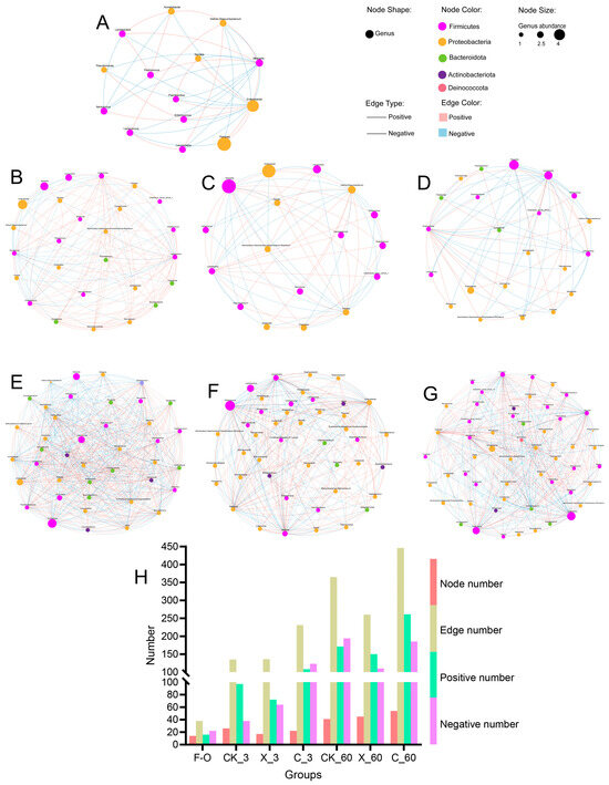 Cooccurrence patterns of the silage bacterial community during the ensiling process. The networks of result (B–G) were treated with different groups, which were CK_3, X_3, C_3, CK_60, X_60, and C_60 treatment groups, respectively. The different of node number, edge number, positive number, and negative number (H) were treated with different treatment groups. (A) were cooccurrence patterns of the fresh oat bacterial community. We selected bacterial communities with a genus level greater than 0.1% for mapping.