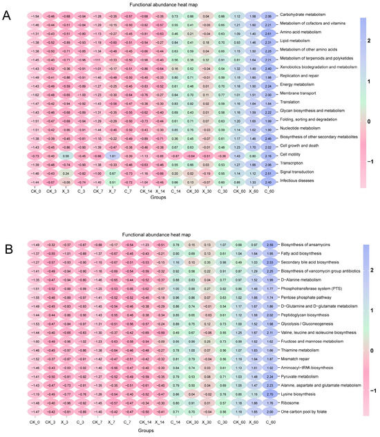 Functional abundance heat map on classification level_2 (A) and level_3 (B) in oat silage with different additive treatments and ensilage days. CK, no additive; X, inoculated with xylanase; C, inoculated with cellulase; 3, 7, 14, 30, and 60 expressed different ensilage days; 0 expressed oat before ensiling; for example, CK_3 expressed that there was no additive after 3 days of silage.