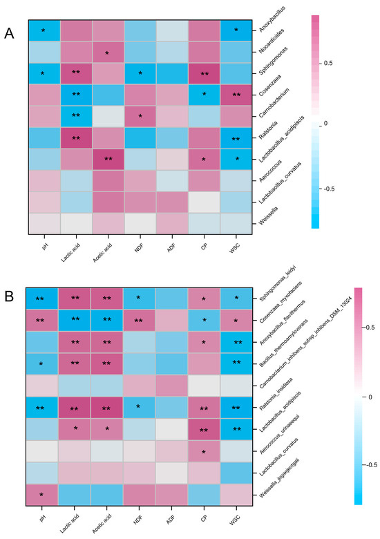 Spearman analysis between silage parameters and the top ten bacterial genus levels (A) and top ten species levels (B) with different additive treatments and ensilage days. NDF, neutral detergent fiber; ADF, acid detergent fiber; CP, crude protein; WSC, water-soluble carbohydrates. * p < 0.05; ** p < 0.01.