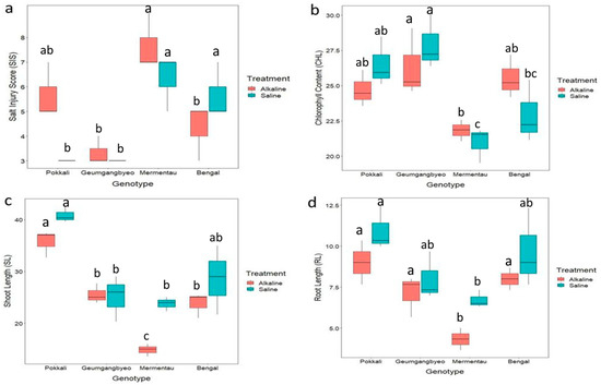 Response of four different genotypes (Bengal, Geumgangbyeo, Mermentau, Pokkali) under alkaline and saline stress. (a) SIS, salt injury score; (b) CHL, chlorophyll content (SPAD units); (c) SL, shoot length (cm); (d) RL, root length (cm). a, b, c represent Tukey lettering for determining difference among genotypes, and shared letters between the genotypes indicate no significant difference at 0.05 probability level.
