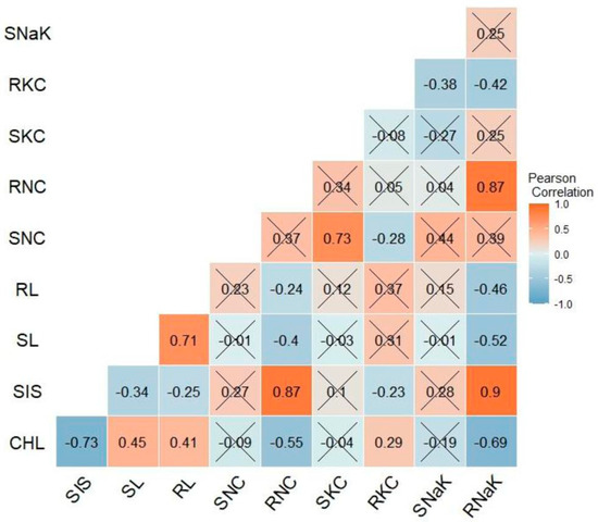 Pearson correlation matrix of different morpho-physiological traits at the seedling stage under saline stress. X depicts nonsignificant correlation between the traits at probability level of 0.05. SIS, salt injury score; CHL, chlorophyll content, SL, shoot length; RL, root length; SNC, shoot sodium concentration, RNC, root sodium concentration; SKC, shoot potassium concentration; RKC, root potassium concentration, SNaK, ratio of the shoot sodium and potassium concentration; RNaK, ratio of the root sodium and potassium concentration.
