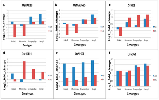 Expression analysis of selected salinity stress-responsive genes 6 h after imposition of saline and alkaline stress in Pokkali (Pok), Geumgangbyeo (Geu), Mermentau (Mer), and Bengal (Ben). The y-axis represents the Log2 fold change in mRNA expression compared with control (no stress), while x-axis represents the genotypes. The genes are (a) OsHAK20 (LOC_Os02g31940), (b) OsMADS25 (LOC_Os04g23910), (c) STRK1 (LOC_Os04g45730), (d) OsHKT1;1 (LOC_Os06g48810), (e) OsNHX1 (LOC_Os07g47100), and (f) OsSOS1 (LOC_Os12g44360).