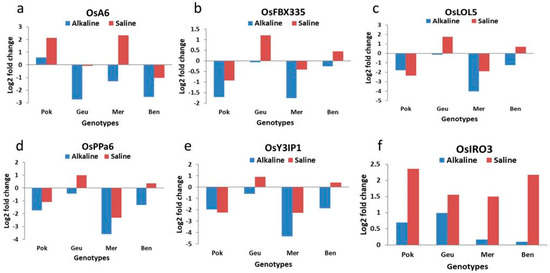 Expression analysis of selected alkalinity stress-responsive genes 6 h after imposition of saline and alkaline stress in Pokkali (Pok), Geumgangbyeo (Geu), Mermentau (Mer), and Bengal (Ben). The y-axis represents the Log2 fold change in mRNA expression compared with control (no stress), while x-axis represents the genotypes. The genes are (a) OsA6 (LOC_Os09g32550), (b) OsFBX335 (LOC_Os09g32860), (c) OsLOL5 (LOC_Os01g42710.1), (d) OsPPa6 (LOC_Os02g52940), (e) OsY3IP1 (LOC_Os01g58470.1), and (f) OsIRO3 (LOC_Os03g26210).