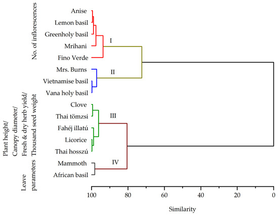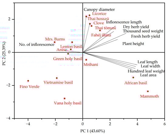 Furthermore, through hierarchical cluster analysis, we were able to identify four distinct morphological categories, as depicted in Figure 1. The initial cluster consisted of five basil genotypes, namely ‘Anise’, ‘Mrihani’, ‘Fino Verde’, ‘Lemon’, and ‘green holy basil’. The second cluster included ‘Mrs. Burns’, ‘Vietnamese’, and ‘Vana holy basil’ cultivars. The third cluster featured sweet basil cultivars, including ‘Clove’, ‘Thai tömzsi’, ‘Fahéj illatú’, ‘Thai hosszú’, and ‘Licorice’, while the final cluster was exclusively composed of ‘Mammoth’ and ‘African basil’ cultivars. In addition, principal component analysis (PCA) revealed relationships between genotypes and quantitative morphological traits (see Figure 2). These two principal components collectively explained 68.99% of the variance, with PC1 accounting for 43.60% and PC2 for 25.39%.