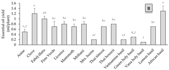 Variability in essential oil production of 15 Ocimum genotypes (A) essential oil content and (B) essential oil yield. Values are presented as Mean ± SD; Different letters indicate significantly different means.
