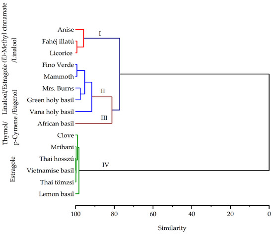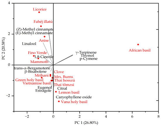 Furthermore, the hierarchical cluster analysis based on the composition of essential oils revealed the presence of four distinct groups (Figure 4). In the first cluster, ‘Anise’, ‘Fahéji illatu’, and ‘Licorice’ basil were grouped due to their higher levels of (E)-methyl cinnamate (>28%) and linalool (>12%). In the second cluster, there was a mixture of components with varying ratios. For instance, ‘Fino Verde’ and ‘Mammoth’ basil displayed linalool ratios exceeding 32.7%. Conversely, ‘Thai tömzsi’ and ‘Mrs. Burns’ basil contained higher levels of estragole (>21%) and linalool (19%). Vana holy basil exhibited significant proportions of eugenol (27.3%) and caryophyllene oxide (14.4%) in the second cluster. The ‘African basil’ was categorized in the third cluster, characterized by a higher ratio of thymol (42.1%) and p-cymene (20.7%). The fourth cluster encompassed ‘Clove’, ‘Thai hosszú’, ‘Vietnamese’, ‘Mrihani’, and ‘lemon’ basils, all of which contained over 60% estragole. As indicated in Figure 5, the PCA further provides insight into the relationship between genotypes and essential oil components. The two principal components explained 47.38% of the variance, PC1 explaining 26.80% and PC2 explaining 20.58%.