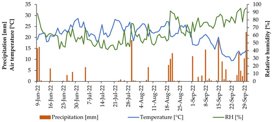 The experiment was conducted in 2022 at the Hungarian University of Agriculture and Life Sciences (MATE) experimental field in Budapest-Soroksár. During the investigation, an average air temperature of 15 °C and a rainfall of 234 mm were recorded. Figure 6 illustrates the daily weather conditions, including rainfall and air temperature. Furthermore, Table 5 shows the soil macronutrient and micronutrient concentrations. It had high concentrations of phosphorus (544.43 mg/kg), potassium (177.36 mg/kg), and significant amounts of micronutrients.