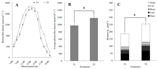The changes in diurnal photon flux density and its average value between the maize monocropping and maize–peanut intercropping. (A) Determination of photon flux density at the ear leaf height of maize, which was conducted hourly from 7:00 to 19:00. (B) Average value of photon flux density. (C) Biomass of maize. * denotes a significant difference (p < 0.05). T1, maize monocropping; T2, maize–peanut intercropping.