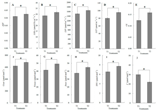The changes in apparent quantum yield (AQY, (A)), light-saturated net photosynthetic rate (LSPn, (B)), light saturation point (LSP, (C)), light compensation point (LCP, (D)), carboxylation efficiency (CE, (E)), CO2 saturation point (Cisat, (F)), Rubisco maximum carboxylation rate (Vcmax, (G)), maximum electron transfer rate (Jmax, (H)), triose phosphate utilization rate (TPU, (I)), and CO2 compensation point (Γ, (J)) between the maize monocropping and maize–peanut intercropping systems. AQY, LSPn, LSP, and LCP were calculated by the Photosyn Assistant software 1.0, fitted by photosynthetic light response curves (Figure 2A). CE, Cisat, Vcmax, Jmax, TPU, and Γ were calculated by the Photosyn Assistant software 1.0, fitted by CO2 response curves (Figure 2B). * denotes a significant difference (p < 0.05). T1, maize monocropping; T2, maize–peanut intercropping.