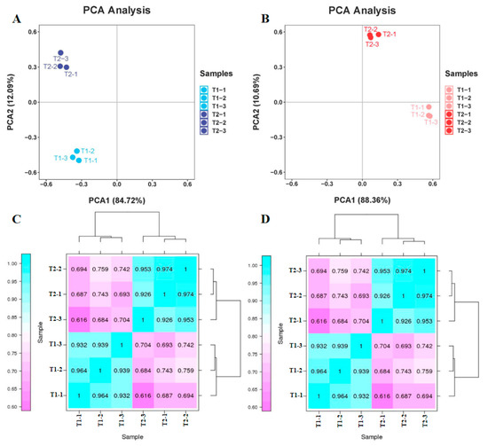 The quality of the raw transcriptome and proteome data were first assessed. Principal component analysis (PCA) exhibited that distinctions between the two varieties and three site samples were evident. In regard to the transcriptome data, 72.16% of the differences between samples could be interpreted through PCA1 (84.72%) and PCA2 (12.09%) (Figure 4A). In regard to the proteome data, 99.05% of the variance between samples can be illustrated via PCA1 (88.36%) and PCA2 (10.69%) (Figure 4B). These results indicate that the differentially expressed genes (DEGs) and differentially expressed proteins (DEPs) showed a dynamic change pattern during the two treatments. The transcription and proteome data of the hierarchical clustering analysis (HCA) revealed low differences in biological replication. The correlation coefficient from the transcriptome and proteome data were up to 0.92 and 0.91 among the biological replicates, respectively. The PCA and HCA results indicated a good correlation between biological replicates. The above results proved the stability and repeatability of the results and provided a guarantee for the reliability of the results.