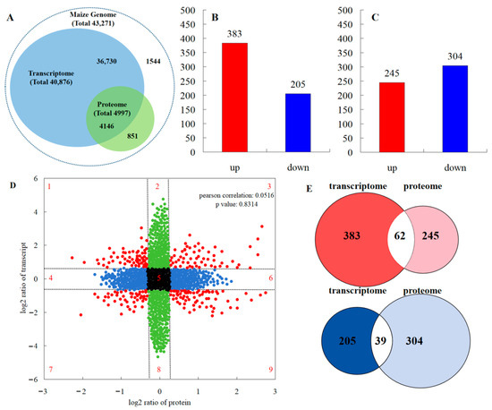 Comparisons of the protein and transcript abundances in the leaves between maize monocropping and maize–peanut intercropping systems. (A) Congruency between the detected transcripts and the proteins of the maize leaves. (B) Number of DEGs (FC ≥ 1) with FDR ≤ 0.01). (C) Number of DEPs (absolute value of log2 (1.2-fold change with p value < 0.05). (D) Nine quadrant association transcriptome and proteome analyses. The dashed lines divide the graph into nine parts. The black dots indicate that neither the transcripts nor the proteins are differentially expressed; the blue dots indicate that proteins are differentially expressed but transcripts are not; the green dots indicate that transcripts are differentially expressed but proteins are not; the red dots represent both differentially expressed transcripts and proteins. (E) Venn diagram of transcriptome and proteome differential expression. Red represents up-regulation; blue represents down-regulation.