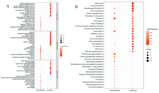 Enrichment analysis of transcriptome and proteome changes between maize monocropping and maize–peanut intercropping. (A) GO enrichment analysis of the differentially expressed genes and proteins. (B) KEGG enrichment analysis of the differentially expressed genes and proteins.