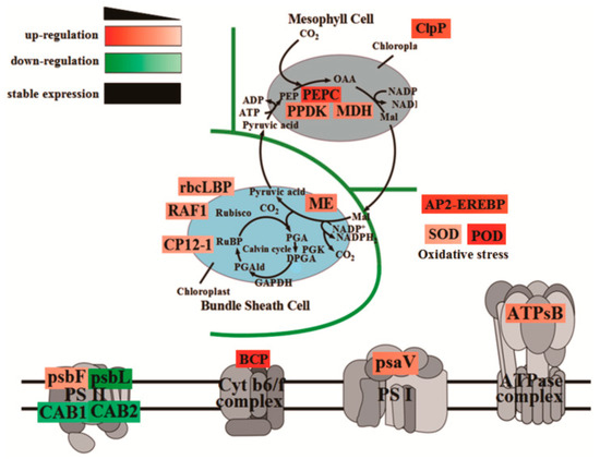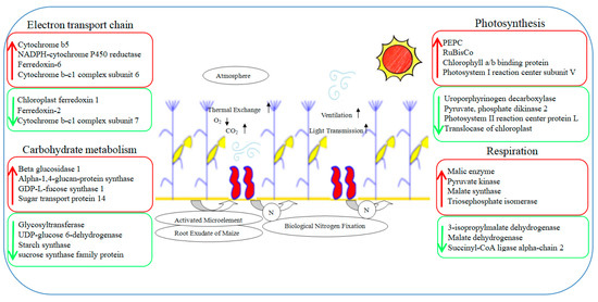 A speculated working model showcases photosynthesis changes in maize for the maize–peanut intercropping system. Red represents up-regulated expression proteins, green represents down-regulated expression proteins.