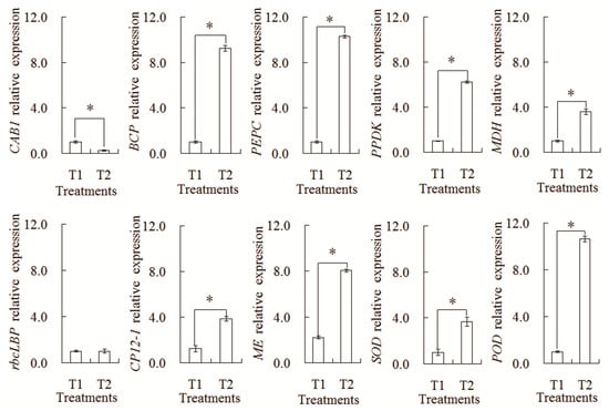 Analysis of transcript levels of the differential abundances of protein species between the maize monocropping and maize–peanut intercropping systems. * denotes a significant difference (p < 0.05). T1, maize monocropping; T2, maize–peanut intercropping.