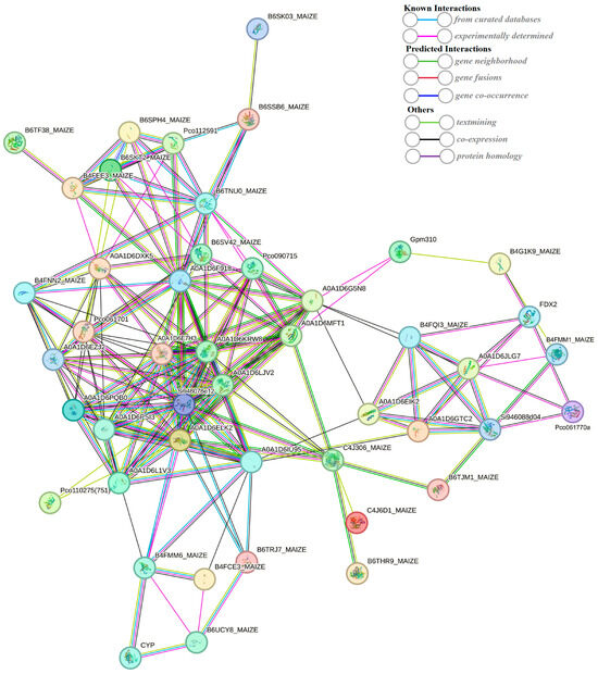 The string database (https://string-db.org/) (accessed on 25 September 2023) is a search database for protein–protein interactions, including both direct physical interactions and indirect functional correlations. A protein–protein interaction network was constructed using 549 DEPs (Figure 10). The interaction network consists of 47 nodes (47 proteins). The previous results of the KEGG enrichment analysis showed that the transcriptome of DEGs was significantly enriched in the photosynthesis (path: ko00195) pathways. What is more, DEPs were also involved in the pathway of photosynthesis (Figure 8). In the protein–protein interaction (PPI) network, two DEPs (red circle) encode ferredoxin-2 and photosystem I reaction center subunit V. Iron redox protein is an iron sulfur protein that transfers electrons in various metabolic reactions. It plays a crucial role in transferring the photoreduction ability to Fd NADP+ oxidoreductase, thereby forming NADPH and mediating the circulating electron flow around photosystem I. Psa V is an important photosystem I reaction center subunit. These results suggest that FDX2 and Psa V may play a role in the photosynthetic changes in the maize kernel in a maize–peanut intercropping system.