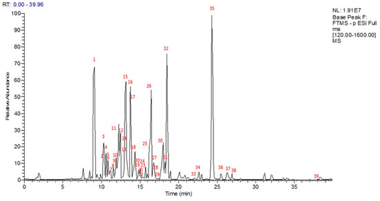 To obtain a preliminary metabolite profile of n-BuOH extract of S. bachtiarica, an analytical approach based on LC-ESI-FT-MS and LC-ESI-FT-MS/MS analysis in negative ion mode was developed, with the detection of 39 compounds (Figure 1). Based on the accurate masses of the main peaks, their distinctive fragmentation patterns, and comparison of the results to information on the Satureja species found in the literature and database (“KNApSAcK”), some of the main peaks were putatively assigned (Table 1). To this extent, specialized metabolites of different classes, mainly corresponding to flavonoids (1, 6–14, 19, 20, 22–23, 25–26, 27, 30–34), monoterpenes (2, 3, 33), indol (4), phenylpropanoids (16, 28), phenolics (5, 15, 17, 18, 29), lignan (21), coumarin (24), biphenyls (35–38), and triterpene (39) were identified.