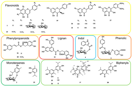In the present study, a total of 39 compounds were detected in S. bachtiarica n-BuOH extract using a LC-ESI/LTQOrbitrap/MS/MS analysis. The LC-MS analysis guided the isolation of compounds, whose structures were elucidated using NMR analysis allowing us to identify specialized metabolites belonging to different classes. The phytochemical investigation revealed that some compounds such as rosmarinic acid (16), p-coumaric acid (17), luteolin (25), and apigenin (31) were already reported as present in the aerial parts of S. bachtiarica [3], while several other compounds (1–15, 18–19, 21–24, 26–30, and 32–39) are reported here for the first time in S. bachtiarica. Of note, the biphenyl derivative (37) is a molecule never reported before in the literature.