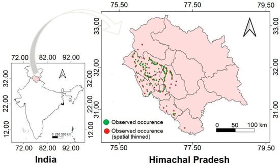 To ensure an even spread of the randomized dataset and avoid overprediction, the sampling bias was eliminated by spatially thinning the occurrence data with the help of the SpThin package applied to R version 3.6.3 [43]. The thinning was performed using the thin distance set of 10 km, which reduced the data points to 56. These points were used for modeling the current distribution of C. vialis (Figure 1).