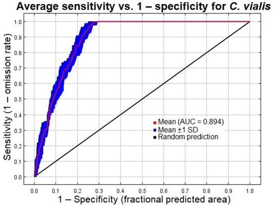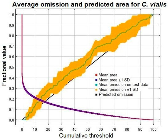 The performance of the threshold-independent ROC curve was investigated as per the AUC values. Since the curve was in proximity to the left axis, alienated towards the upper side, aligned away from the 1:1 line, and had an AUC value of 0.894 ± 0.010, it is considered highly accurate and acceptable (Figure 2). The result suggests that the selected environmental parameters used for the calibration of the model quite accurately forecasted the distribution of C. vialis in the study area. In addition to ROC, the model’s validity and performance were assessed by examining the omission/commission rate (cumulative output), in which the omission (calculated on training presence as well as test records) indicates the proportions of unsuitable localities or pixels, while the predicted area represents suitable pixels. The proximity between the test and predicted omission rates further defined its accuracy (Figure 3).