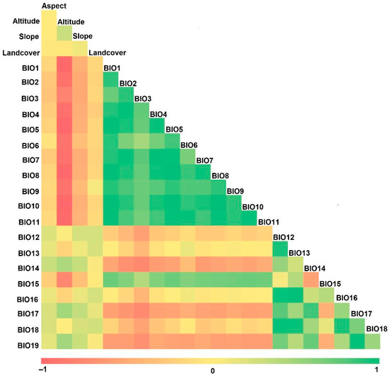 The variables adhered to the shapefile of Himachal Pradesh, which was extracted from the Database of Global Administrative Areas (https://gadm.org/download_country_v3.html; accessed on 5 December 2023). To match the spatial resolution of the bioclimatic layers (30 arc s), topographic data (elevation, slope, aspect, and landcover) were resampled using the bilinear interpolation technique. The selected bioclimatic and topographic parameters were tested for multicollinearity using Pearson’s correlation, and the parameters with a very strong correlation coefficient (with a value ≥ ±0.75) were excluded from further evaluation for better interpretation and generalization [47]. The processed data were then used to predict habitat suitability using ENM.