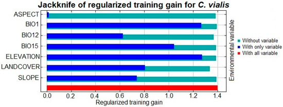 To highlight the relative responses of these variables in the distribution and potential spread of C. vialis, an additional jackknife test was performed, which revealed that BIO1 and elevation produced the highest gain (or the maximum contribution), followed by BIO15, landcover, slope, and BIO12, whereas aspects showed nearly zero contribution (Figure 5).