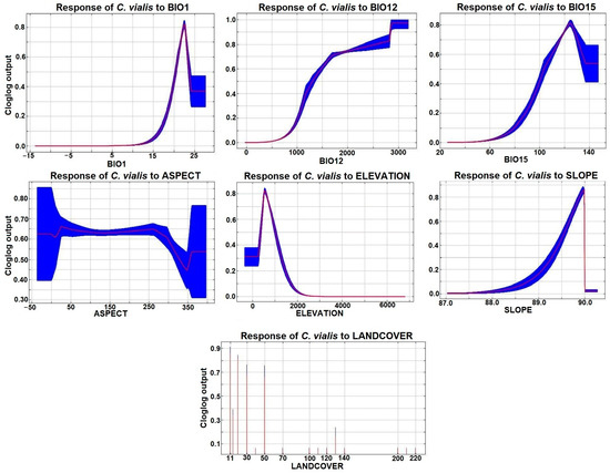 Further, the cloglog output was presented in the form of response curves, which depict changes in the logistic prediction in response to a particular environmental variable, with the remaining variables being constant at a mean sample value. According to the response curves, BIO1 and BIO12 predicted the presence of C. vialis within the ranges of 20–25 and 1300–3000, respectively (Figure 6). The response curve of BIO15 was the maximum within a range of 102–140 (Figure 6). Continuous data for aspect, elevation, and slope had peak response values in the range of −50 to 310, 300 to 1000, and 89.6 to 89.9, respectively (Figure 6). Elevation data showed the distribution of C. vialis up to 2000 m asl, with the maximum presence around 600–700 m asl (Figure 6). Along with bioclimatic variables, Globcover landcover categorical data showed that category 11 is the most important in forecasting the distribution of C. vialis, followed by categories 20, 30, and 50 (Figure 6).