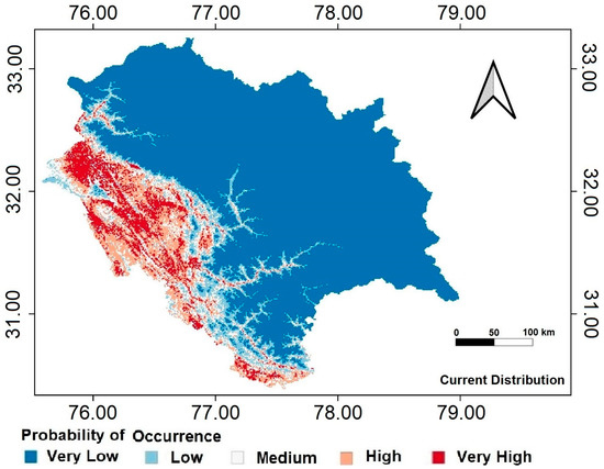 The comparative significance of the parameters used in the model was appraised via the jackknife procedure. Based on a logistic threshold of 10 percentile training presence, the output of MaxEnt directly predicts whether an area is good for a certain species on a scale from 0 to 1. Accordingly, the suitable habitats were classified into different categories, with values in the range of 0.0–0.10 representing “very low” suitability, 0.10–0.30 representing “low” suitability, 0.30–0.50 representing “medium” suitability, 0.50–0.70 representing “high” suitability, and 0.70–1 representing “very high” suitability [50]. The pixels in the cloglog output format show different categories of habitat suitability, which were extracted, counted, and changed into a unit of area (km2) to estimate the exact proportion of the region occupied by the species. The results are presented in different formats, showing the sensitivity, validity of the model, and suitability of the habitat.