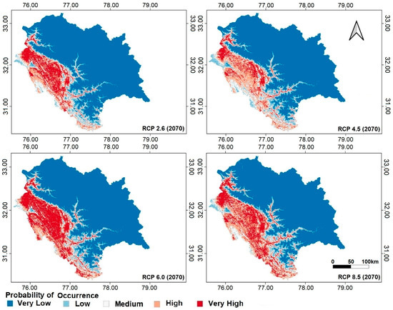 The probable niche distribution of Calyptocarpus vialis in Himachal Pradesh under future climatic scenarios (RCP 2.6, 4.5, 6.0, and 8.5) by 2070.