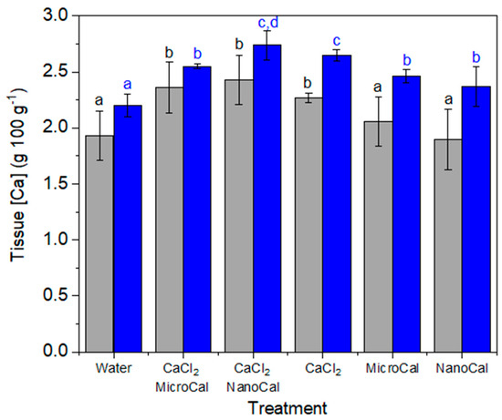 Calcium concentrations of sunflower leaves (grey bars) and basil (blue bars) aerial plant parts 1 day after foliar spraying of CaCl2 alone or in combination with MicroCal or NanoCal. Data are means ± SD (N = 3). Different letters indicate homogenous groups according to Tukey’s HSD test (p < 0.05).