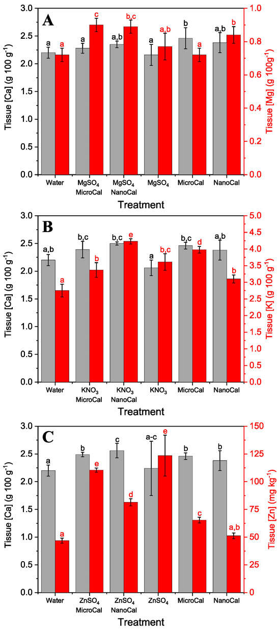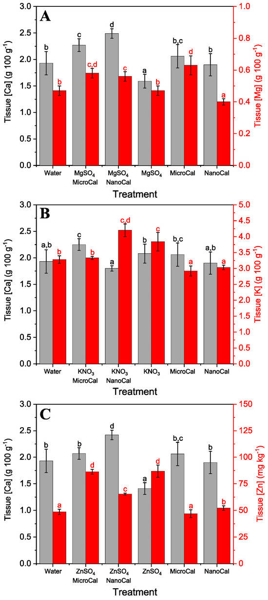 Calcium, Mg, K, and Zn concentrations of sunflower leaves 1 day after foliar spraying MgSO4, KNO3, and ZnSO4 alone or in combination with MicroCal or NanoCal. Grey bars correspond to tissue Ca concentration, and red ones relate to either Mg (A), K (B), or Zn (C) concentrations. Data are means ± SD (N = 3). Different letters indicate homogenous groups according to Tukey’s HSD test (p < 0.05).