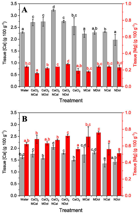 Calcium (grey bars) and Mg (red bars) concentrations of kale (A) and Swiss chard (B) aerial plant parts, 1 day after foliar spraying different treatments containing calcite and dolomite micro-and nano-particles and CaCl2. Data are means ± SD (N = 3). Different letters indicate homogenous groups according to Tukey’s HSD test (p < 0.05).