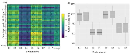 Genotypic performance across the different locations. (A) Genotypes’ grain yield means across the 8 different environments. (B) Box plot of grain yield for the 8 different environments explaining the differences among the 4 locations.