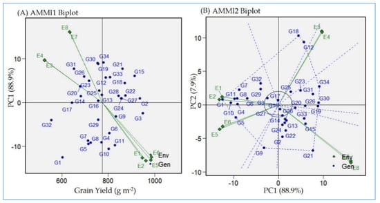 (A) The “AMMI1” biplot displays the main effect (GY) and IPC1 effect values explaining the relationship among tested genotypes and environments. (B) The “AMMI2” biplot displays the main axes of G+GEI effect (IPCA1 and IPCA2) values for the tested genotypes and environments. The tested genotypes are 34 (G1:G34 in blue color) grown in four locations in the two consecutive years, 2021 and 2022 (E1 and E2 = Sakha; E3 and E4 = Alexandria; E5 and E6 = Gemmiza; E7 and E8 = Kharga oasis).