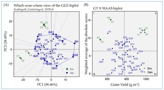(A) The “which–won–where” polygon biplot displays the winning genotypes at each environment. (B) The “GY vs. WAAS” biplot displays the most-adopted genotypes across the tested environments. The tested genotypes are 34 (G1:G34 in blue color) grown in four locations in the two consecutive years, 2021 and 2022 (E1 and E2 = Sakha; E3 and E4 = Alexandria; E5, and E6 = Gemmiza; E7 and E8 = Kharga oasis).